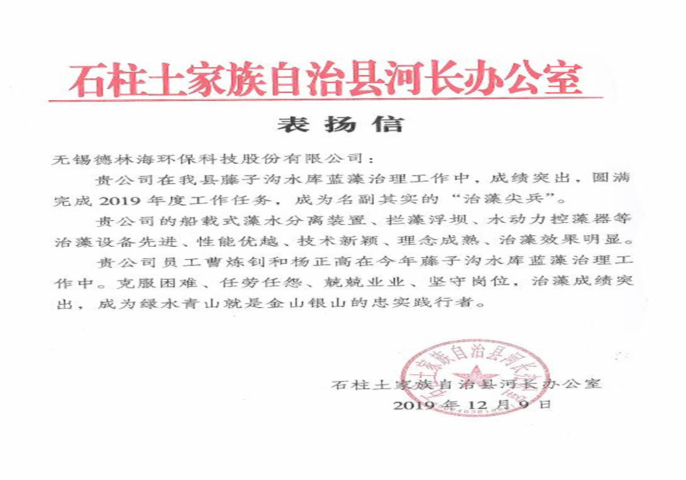 今年4月,重慶石柱土家族自治縣河長(zhǎng)辦公室向我司采購(gòu)了船載式藻水分離裝置、攔藻浮壩、水動(dòng)力控藻器等治藻設(shè)備,由于現(xiàn)場(chǎng)作業(yè)條件特殊,我司員工克服困難、任勞任怨、兢兢業(yè)業(yè)的完成了工作任務(wù)。信中對(duì)我司圓滿完成重慶藤子溝水庫(kù)藍(lán)藻治理工作,給予高度好評(píng),贊揚(yáng)我司是名副其實(shí)的“治藻尖兵”。