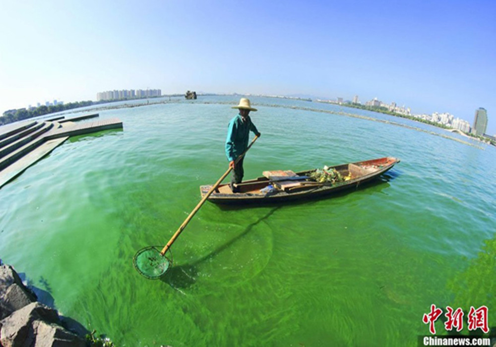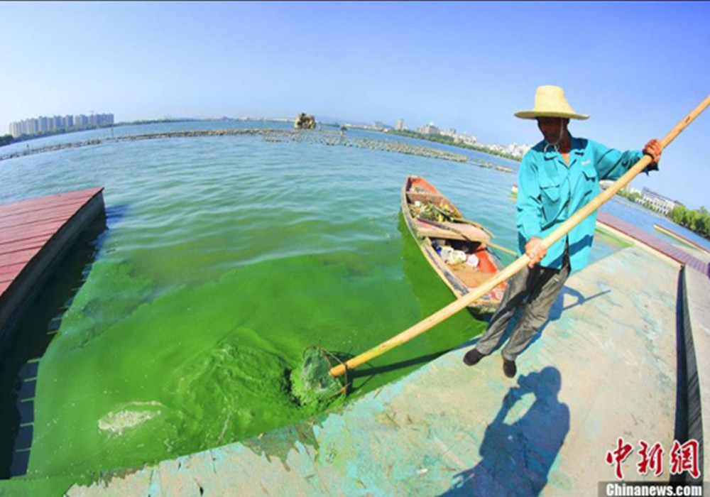 2013年7月24日,浙江紹興,由于污染嚴重導致水質惡化,每年夏季柯橋瓜渚湖都會爆發藍藻。2012年藍藻大爆發時,直接導致10多萬斤養殖魚死亡。今年入夏以來,也有數千斤魚類死亡,由于魚類死亡太多,因此今年漁民不再放養魚苗。