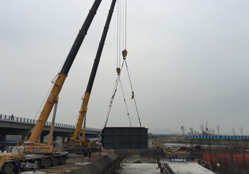 派河口藻水分離站工程主要服務(wù)渡江戰(zhàn)役紀念館以西,蓮花圩以北巢湖西北岸線,岸線長度約8.3km。根據(jù)派河口藻水分離站的設(shè)備采購需求,需將分離池主體安裝到工程基礎(chǔ)。2015年4月18日,我公司經(jīng)過實地勘察、詳細研究,熟練掌握吊裝技術(shù)、攻克吊裝難關(guān),成功把分離池主體吊裝到位,確保設(shè)備安全、快捷的安裝到位,同時也為以后藻水分離站建設(shè)的更加效率做鋪墊。