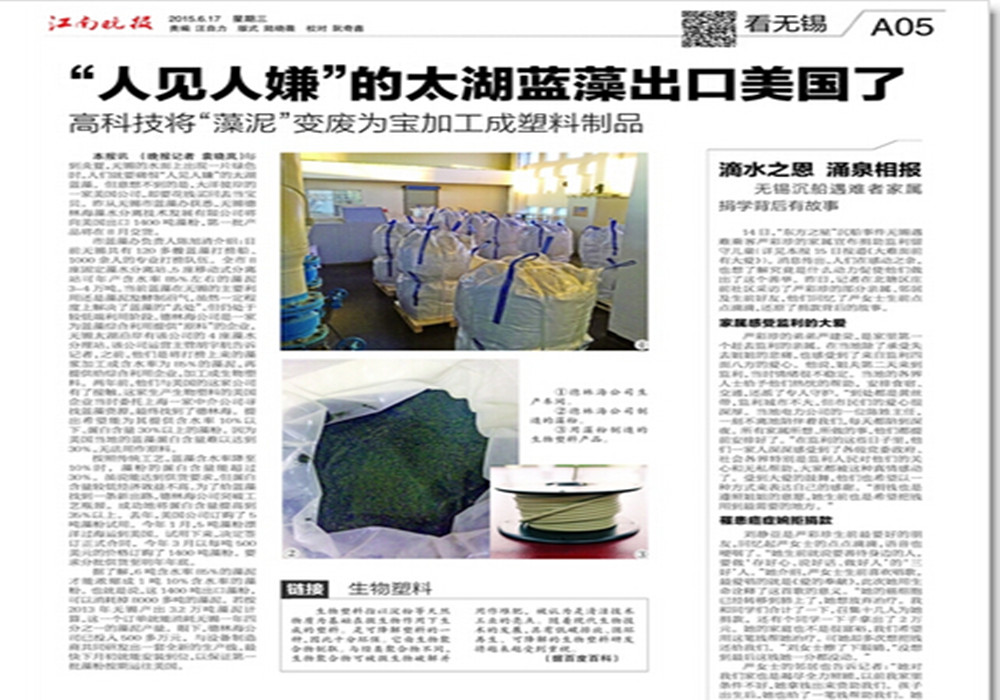 (2015年6月18日)無錫藍藻資源化利用又走出一條新路。無錫德林海藻水分離技術發(fā)展有限公司已研制出將藻泥制成含水率10%以下的藻粉技術,這些藻粉可制成生物塑料,目前已接到一家美國企業(yè)1400噸的訂單。