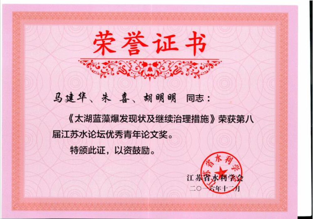 恭賀馬建華、朱喜、胡明明同志編寫的《太湖藍(lán)藻爆發(fā)出狀及繼續(xù)治理措施》榮獲第八屆江蘇水論壇優(yōu)秀青年論文獎(jiǎng)。