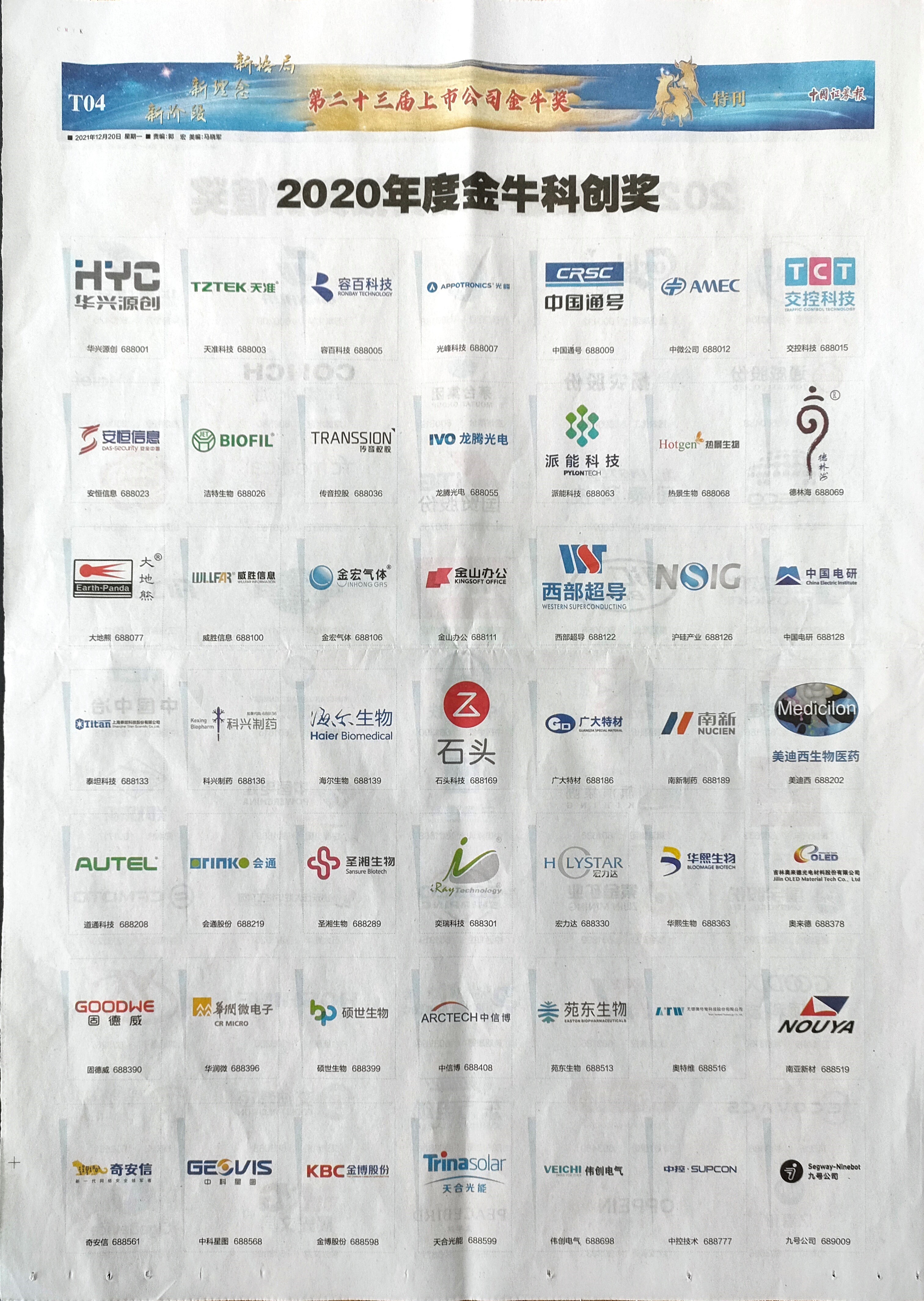 《中國證券報》2021年12月20日《第二十三屆上市公司金牛獎》特刊T04版