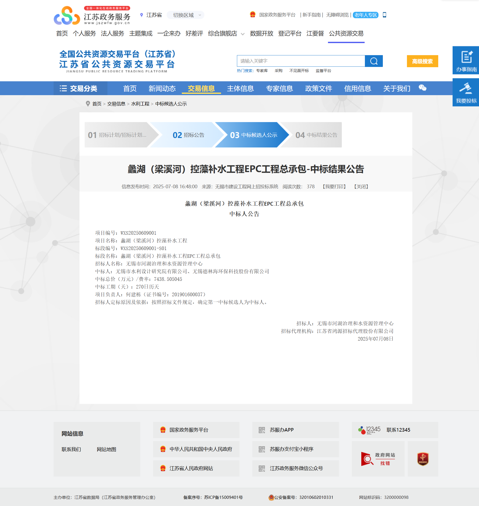 《蠡湖(梁溪河)控藻補水工程EPC工程總承包》項目中標結果公告