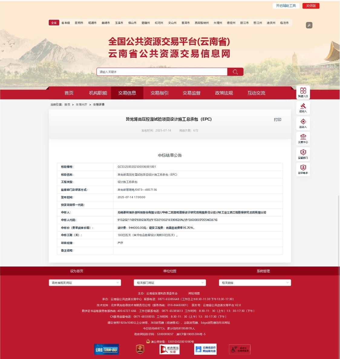 《異龍湖高壓控藻試驗項目設計施工總承包(EPC)》項目中標結果公告