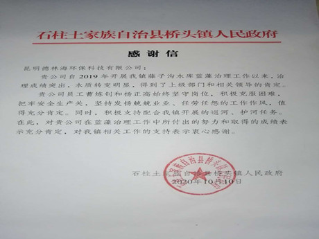 2020年10月10日,我司收到了一封來自石柱土家族自治縣橋頭鎮人民政府的表揚信。