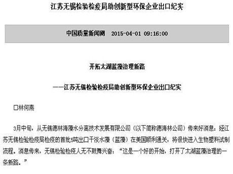 3月中旬,從無錫德林海藻水分離技術發展有限公司(以下簡稱德海林公司)傳來好消息:經江蘇無錫檢驗檢疫局檢疫的首批5噸出口干淡水藻(藍藻)在美國順利通關,將很快進入生物塑料試制流程。消息傳來,無錫檢驗檢疫人無不鼓舞興奮:“這是一個好的開始,打開了太湖藍藻治理的一條新路。”