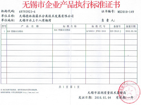 德林海藻水分離站企業標準已獲無錫市質量技術監督局批準備案